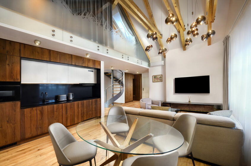 Luxusne a kompletne vybavený apartmán mezonetového typu sa nachádza na druhom poschodí. Veľkorysý priestor a prvotriedne vybavenie poskytujú absolútne pohodlie s orientáciou do tichého parku. Súčasťou ubytovania je možnosť využívania služieb Hotela Lomnica*****.