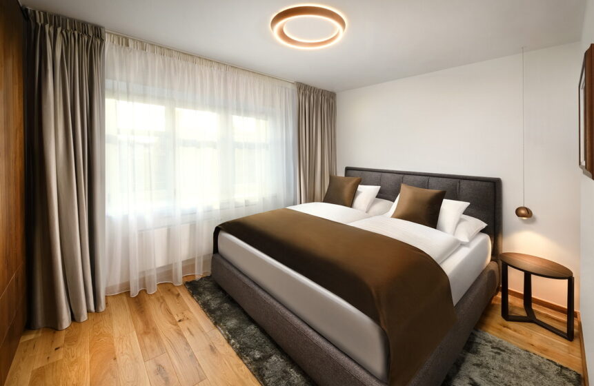 Apartmán vhodný pre rodiny či partie oddeľuje spoločenskú časť s hlavnou spálňou.